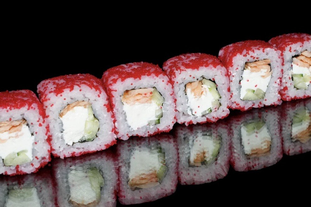 Рис, нори, тобика, огурец, твороженный сыр, жареный лосось