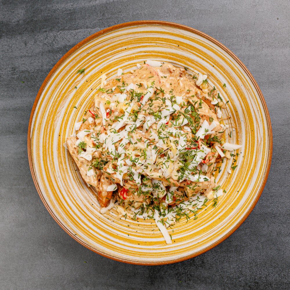 Лук репчатый, куриное филе, болгарский перец, картофель айдахо, сливки, укроп.