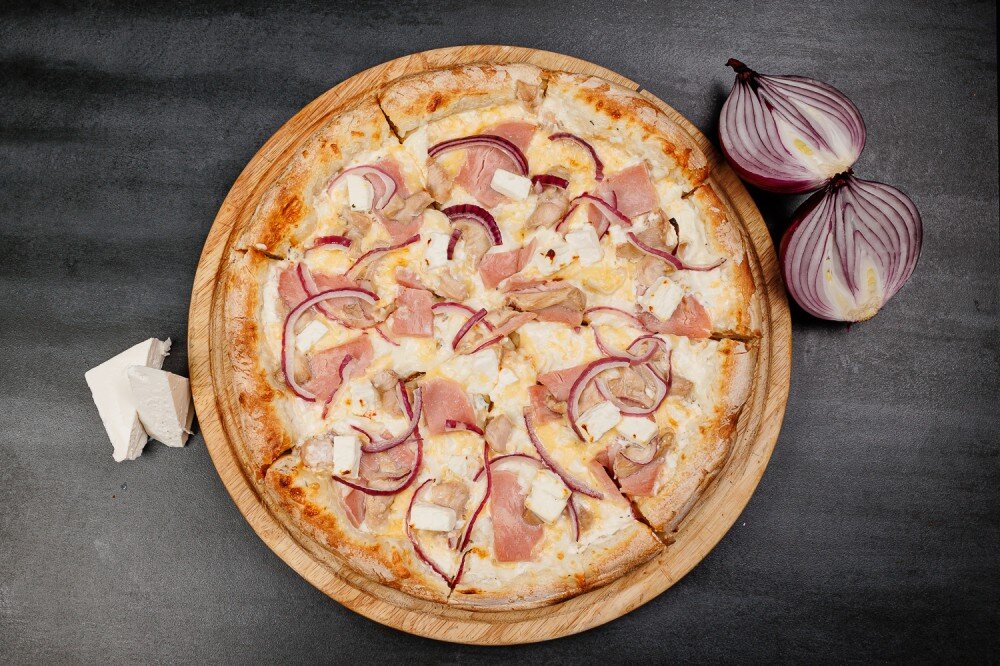 Тесто, белый соус, моцарелла, фета, ветчина, лук ялтнский, куриное филе.