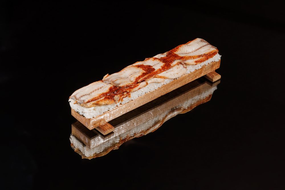 Рис, нори, творожный сыр, угорь, соус унаги.