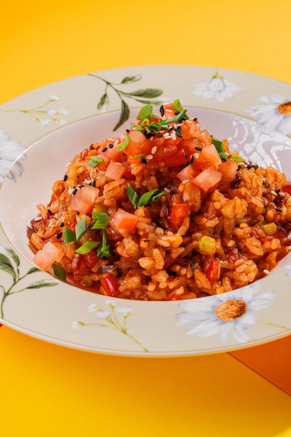 рис/масло растительное/перец болгарский/лук репчатый/шампиньоны/помидор/цукини/зелёный лук/соус красный/кунжут