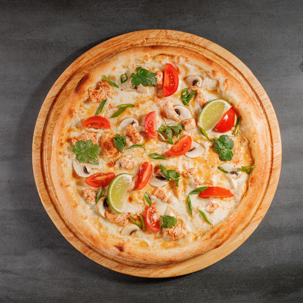 Моцарелла, черри, шампиньоны,лук зелёный,куриное филе,соус Том Ям