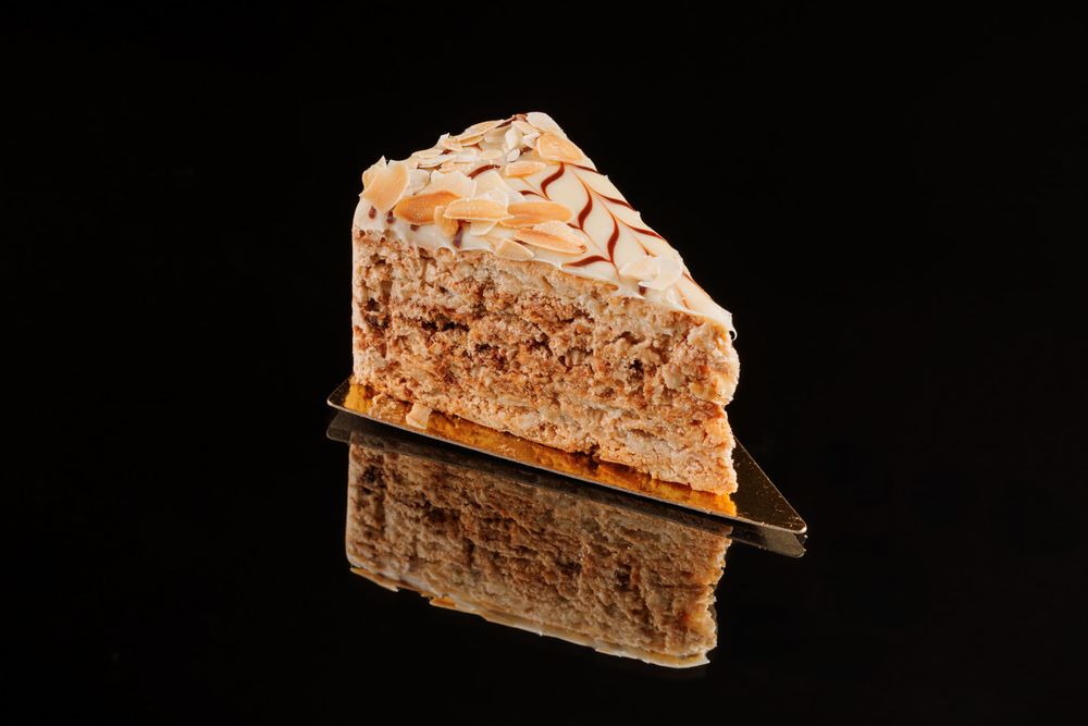 белково-ореховые коржи с заварным кремом,белым шоколадом и миндальными липестками