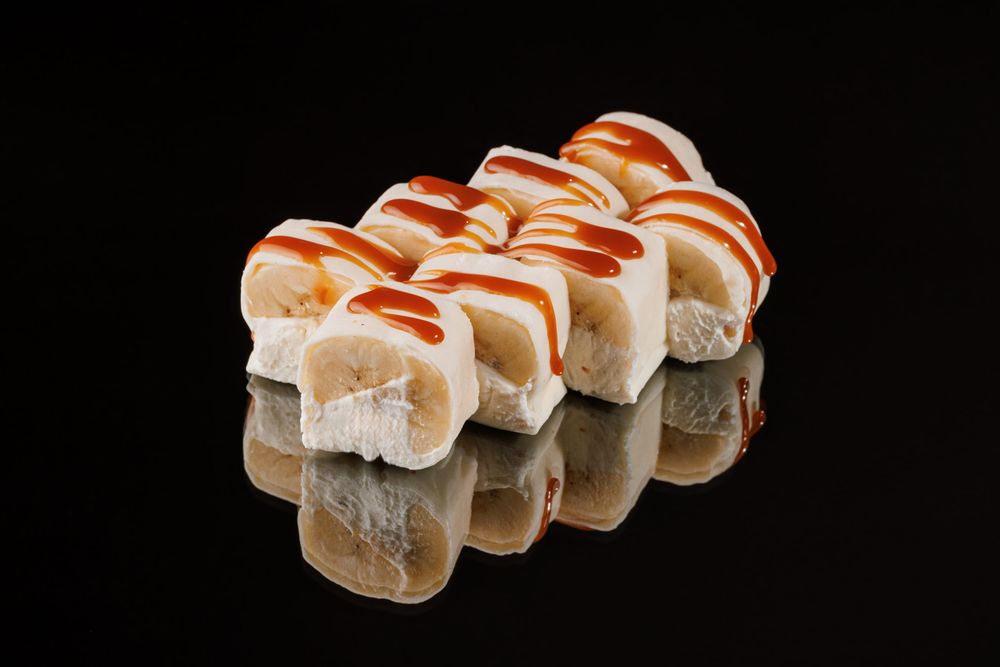 Тесто для спринг роллов,карамельный топинг,арахис,банан,креммета
