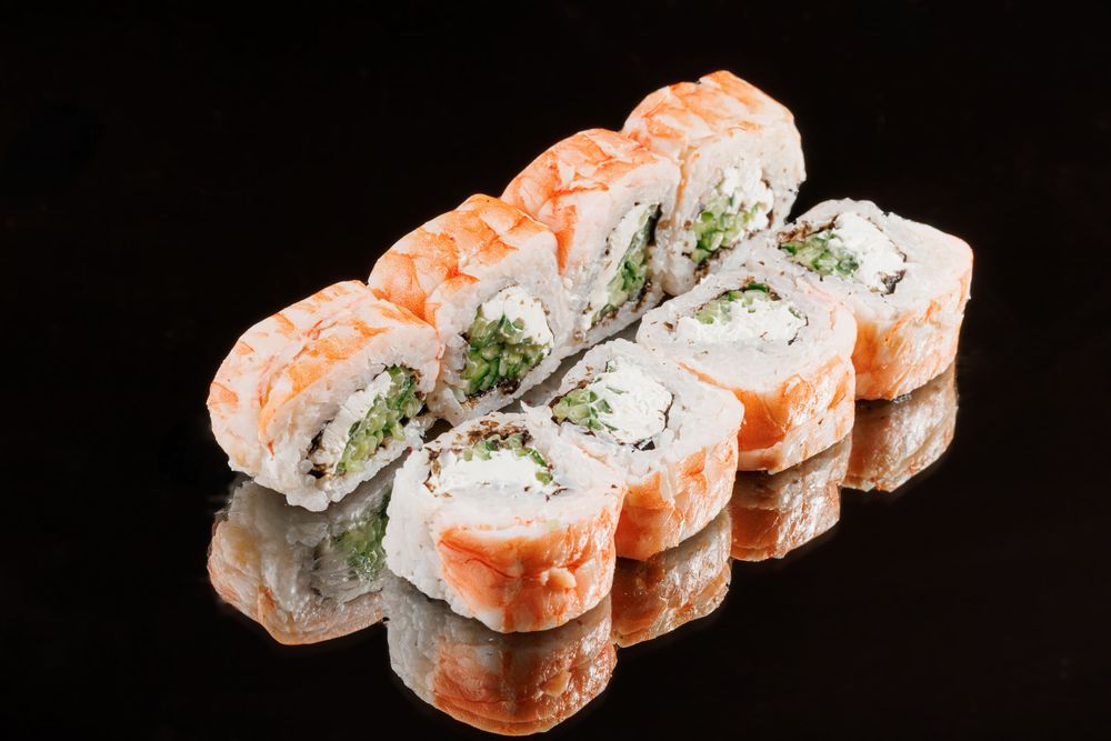 Рис, творожный сыр, огурец, нори, креветка.