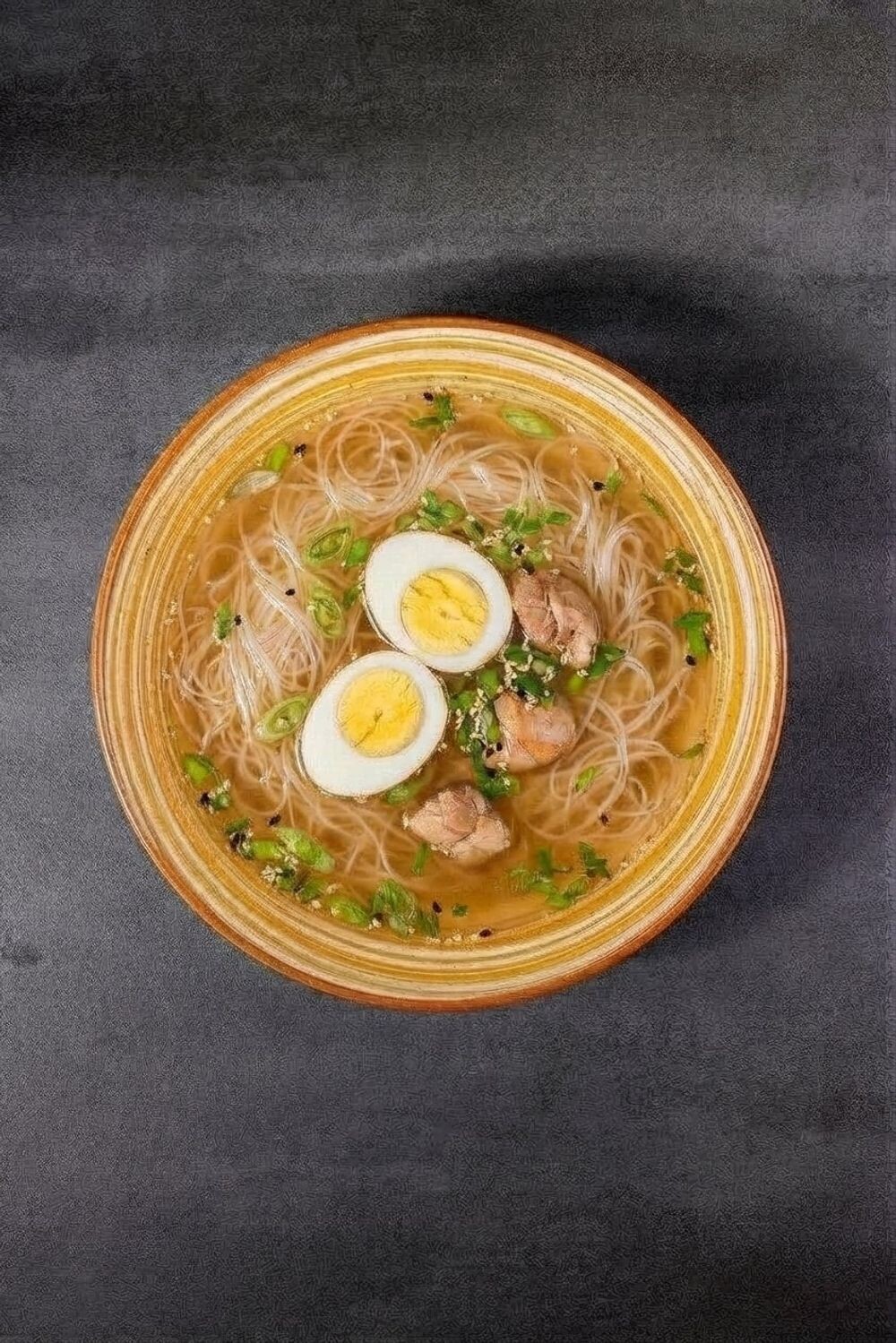 Куриный бульон, перепелиное яйцо, куриное филе, зелень