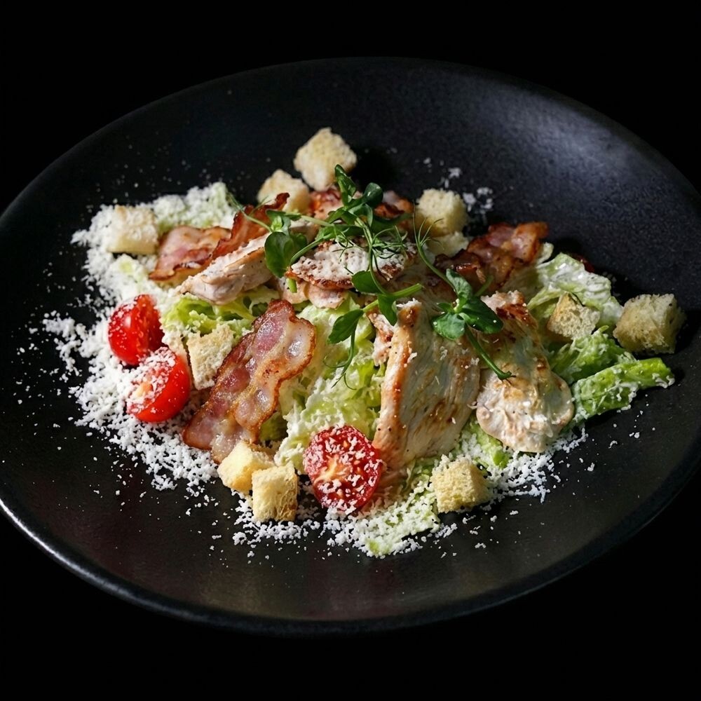 Айсберг, куриное филе, яйцо перепелиное, помидор черри, соус цезарь, сухари, пармезан.