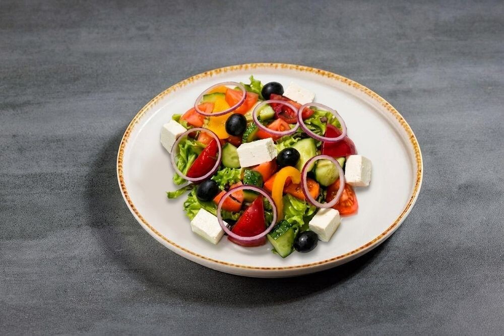 Микс салата, помидор, огурец, перец болгарский, лук ялта, маслины, сыр фета, соус песто, орегано.